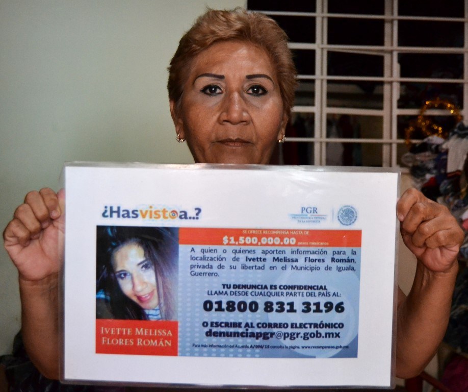 Sandra Luz Román Jaimes ha 55 anni ed è di Iguala. Lotta contro un cancro e per ritrovare la figlia Ivette Melissa Flores Román, che ha oggi 25 anni ed è scomparsa il 24 ottobre 2012. Sandra accompagna nel cammino il nuovo collettivo costituito a Iguala lo scorso 15 aprile e che si chiama “Madres Igualtecas en Busca de sus Desaparecidos”.