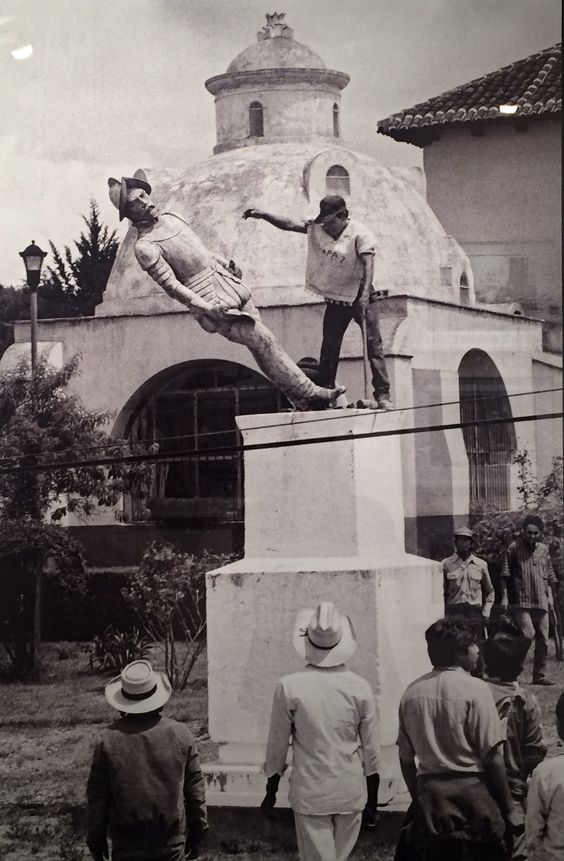 Il fotografo messicano Antonio Turok cattura l’abbattimento della statua di un generale coloniale spagnolo nel sud del Messico, un’azione portata avanti da quelli che pochi anni più tardi si presenteranno al mondo come Zapatisti.