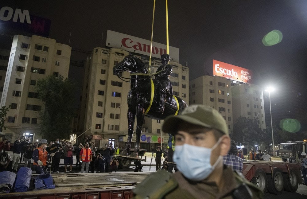 Alcuni giorni fa, nella capitale cilena, è caduto un altro simbolo: il monumento equestre del Generale Baquedano, ‘rimosso per restauro’ nelle intenzioni del Consejo de Monumentos Nacionales. Baquedano a lungo è stato considerato eroe nazionale, per le sue gesta nella Guerra del Pacifico e nella ‘pacificazione della Araucania’, il nome che la storiografia ufficiale dà all’espansione del Cile a danno dei mapuche. Per lui era stata eretta una statua e intitolata una piazza, che tutti però chiamavano Plaza Italia. È stata quella piazza ad accogliere i milioni di manifestanti che hanno dato vita alla rivolta del 2019, innesco del processo costituente in atto. Ed è stata ribattezata Plaza Dignidad (si trova così anche su Google Maps) e il Baquedano a cavallo è diventato il simbolo del conflitto tra il vecchio e il nuovo ordine.