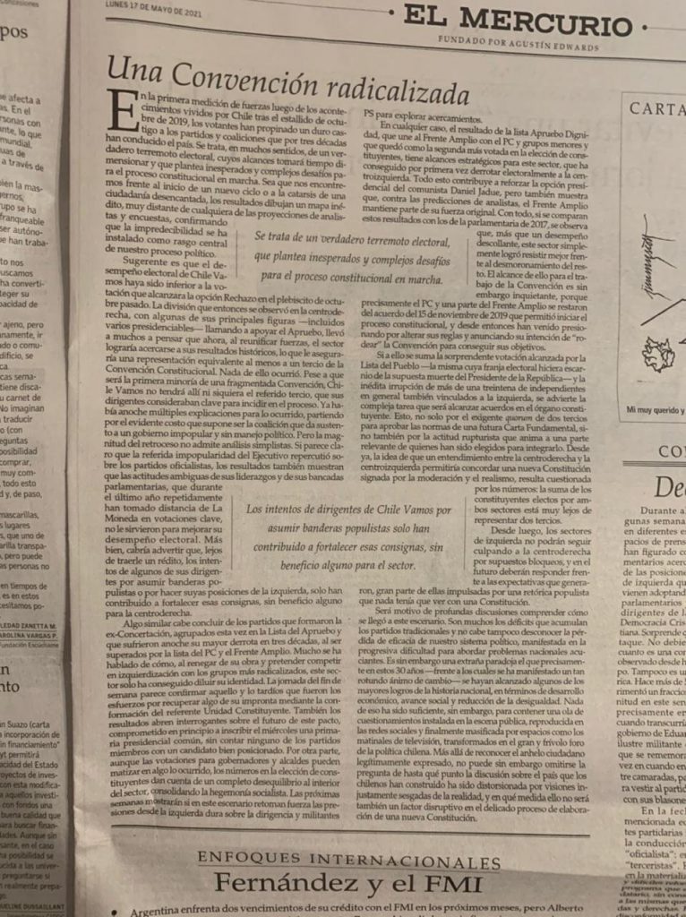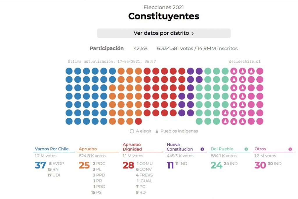 La destra del presidente Piñera è la grande sconfitta. Uniti nella lista Chile Vamos, i partiti conservatori hanno ottenuto 37 seggi su 155, ben sotto ai 52 (1/3 del totale) su cui speravano per ottenere diritto di veto sugli articoli della Magna Carta. https://www.emol.com/noticias/Nacional/2021/05/16/1020754/Convencion-Constitucional-Conformacion-Constituyentes-Elegidos.html