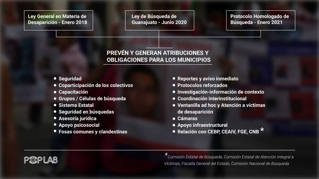 El objetivo debe ser elaborar políticas públicas desde el nivel local que, coordinándose con los grupos sociales interesados y con las instituciones estatales y federales involucradas, vayan más allá de lo previsto por la Ley General en Materia de Desaparición, por la Ley General de Víctimas, y por las equivalentes leyes estatales, la Ley para la Búsqueda de Personas Desaparecidas en el Estado de Guanajuato y la Ley de Víctimas del Estado de Guanajuato, además del Protocolo Homologado de Búsqueda. En todas estas normativas la coordinación interinstitucional, así como el principio de participación conjunta con las víctimas, son principios fundamentales a tener en cuenta. Al respecto, existe una deuda pendiente de los gobiernos municipales con las y los desaparecidos que ya pesa y no puede ser ignorada durante tres años más.