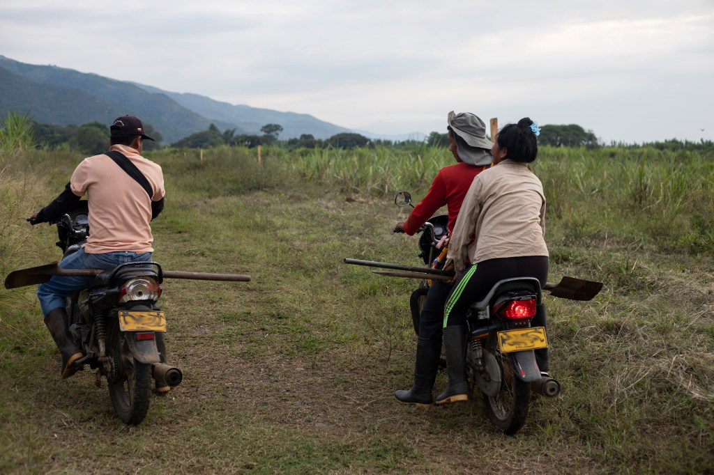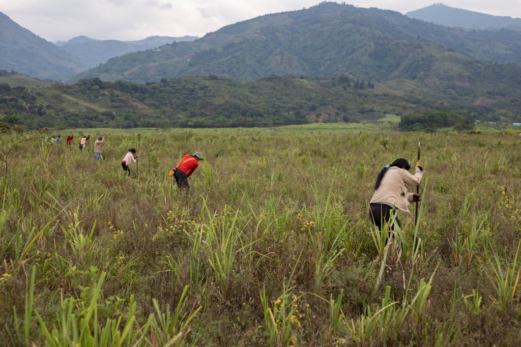 Tra le pratiche messe in campo dalle comunità di Caloto c’è la cosiddetta «Liberazione della Madre Terra», ovvero la riconversione di ettari di cañaverales, i canneti delle imprese che producono agrocombustibili, in terreni adatti all’agricoltura e all’allevamento. I membri della comunità si spostano in moto con i machete, le zappe, i pali di legno e il filo per delimitare il terreno liberato. Si procede in perfetta sincronia con il lavoro collettivo che nella tradizione indigena dell’area andina viene chiamato la «Minga». Secondo Abel, la liberazione della madre terra raccoglie l’eredità della resistenza dei popoli nativi alla colonizzazione e la lunga storia del recupero dei terreni che durante il Novecento ha visto protagoniste le comunità indigene.