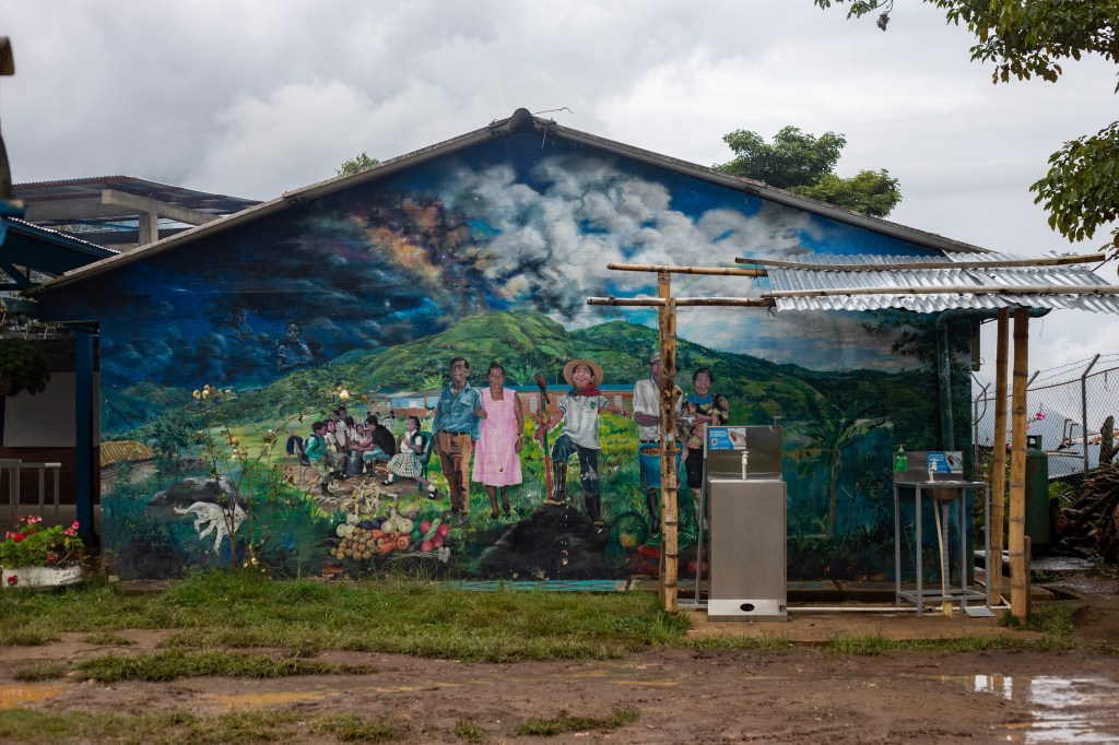 Superando gli appostamenti delle Farc si trova la scuola rurale “El Credo”. Qui bambini e bambine imparano a fare i calcoli mentre si prendono cura della terra e degli animali, gli si insegna a suonare uno strumento musicale e a preparare il mangime per la fattoria. Durante i periodi di conflitto più intenso, l’edificio si trasforma in un rifugio per tutta la comunità, che si chiude nella scuola per giorni, settimane o anche mesi, mentre fuori si spara. All’entrata della scuola c’è un murale in cui è raffigurato lo spirito comunitario che guida le attività didattiche.