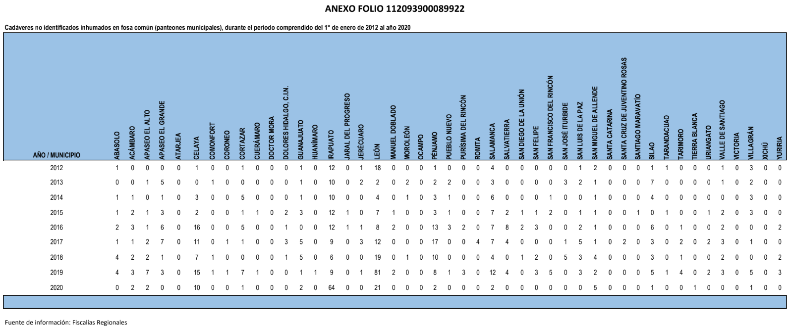 [5] Datos de FGEG y fiscalías regionales (respuesta del 12 de septiembre de 2022), ANEXO FOLIO 112093900089922: “Cadáveres no identificados inhumados en fosa común (panteones municipales), durante el periodo comprendido del 1° de enero de 2012 al año 2020”. La cifra de 825 cuerpos fue confirmada también en la respuesta a una solicitud más reciente, del 10 de marzo de 2023, con folio 112093900023523.