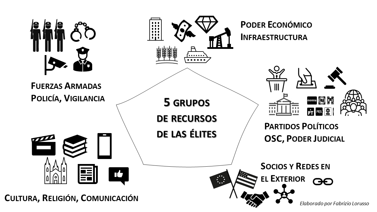 Éste identifica cinco “grupos de recursos” que las élites han movilizado a su favor en la historia de nuestro subcontinente para construir y mantener la dominación, con más o menos consenso, según el momento: las Fuerzas Armadas, el poder económico, los partidos políticos, la cultura y la comunicación, y finalmente, los socios en el exterior.
