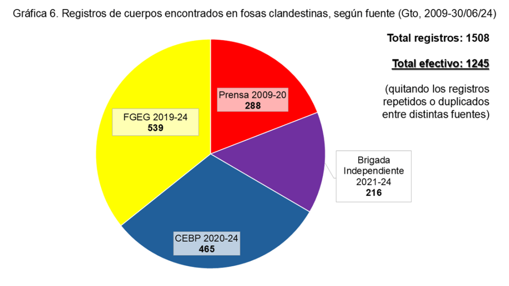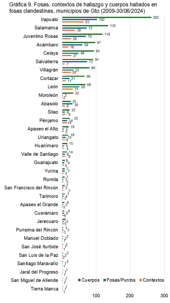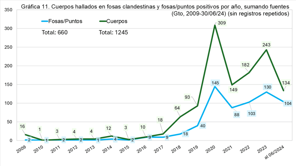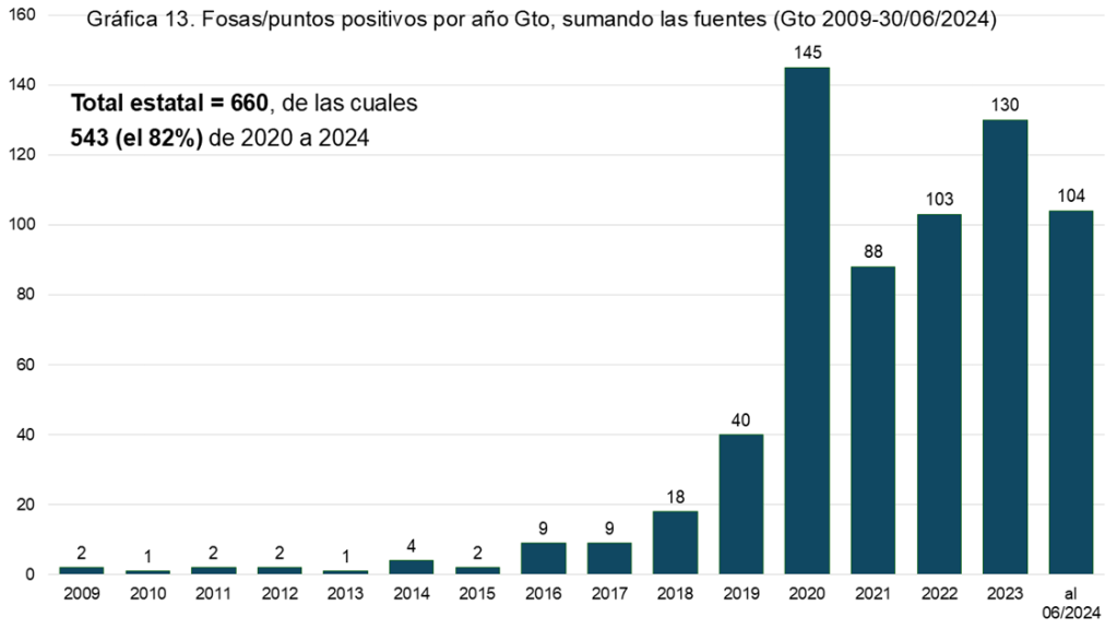 Con las fuentes disponibles, entre enero de 2009 y el 30 de junio del 2024, se registraron en Guanajuato por lo menos 660 fosas clandestinas, encontradas en 349 distintos “contextos” o “sitios de hallazgo” en 33 de los 46 municipios, de las cuales fueron exhumados 1,245 cuerpos o restos humanos individualizados.
