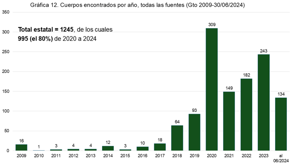 Se destaca que, de los 1,245 cuerpos exhumados de fosas clandestinas en Guanajuato entre 2009 y 2024, 995, o sea, el 80% del total, fueron encontrados entre el 2020 y junio de 2024.