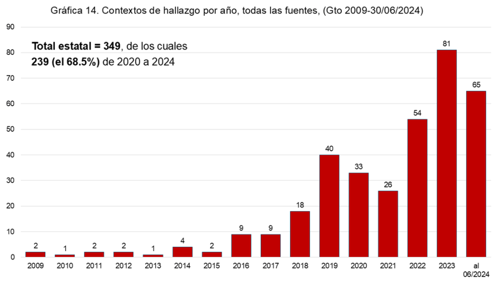 Finalmente, de los 349 contextos de hallazgo distintos registrados en Guanajuato entre 2009 y 2024, 239, o sea, el 68.5% del total, fueron localizados entre 2020 y junio de 2024.