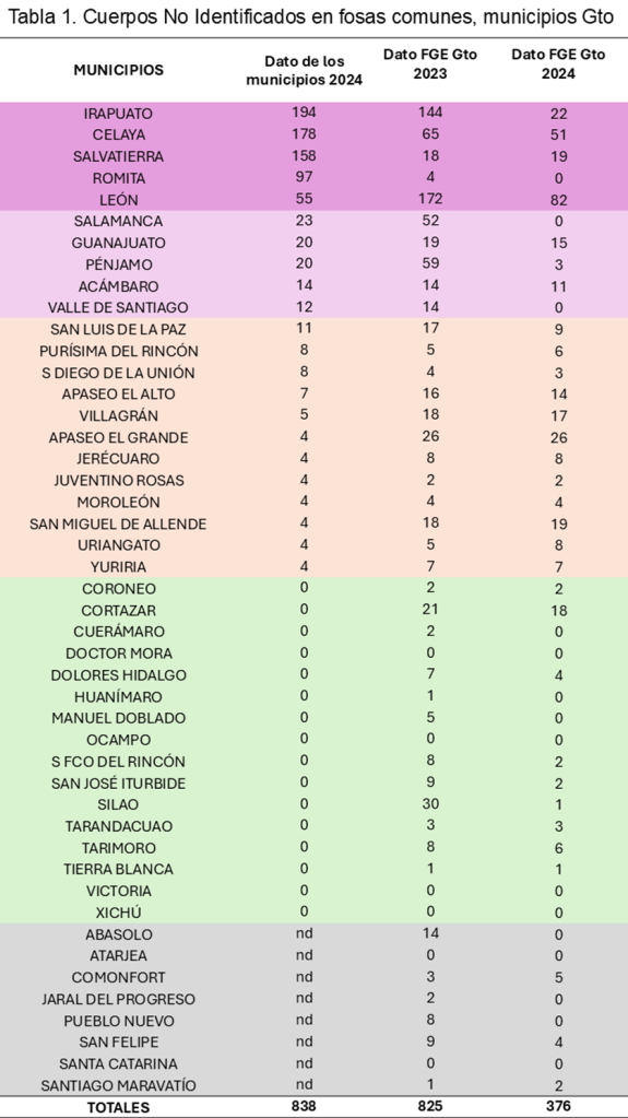 La tabla 1 contiene una lista completa de los municipios guanajuatenses con la indicación en tres columnas de: (1) el número de cuerpos no identificados en sus fosas comunes o gavetas individuales o cualquier otro tipo de instalación según distintas fuentes, según respuestas de los propios municipios en 2024; sobre lo mismo, (2) la respuesta de la FGEG en 2023, y en 2024 (3). En la integración de la primera columna, se señala que seis municipios no respondieron: Abasolo, Atarjea, Jaral del Progreso, Pueblo Nuevo, Santa Catarina, Santiago Maravatío. Otros dos, San Felipe y Comonfort, se negaron a entregar la información.