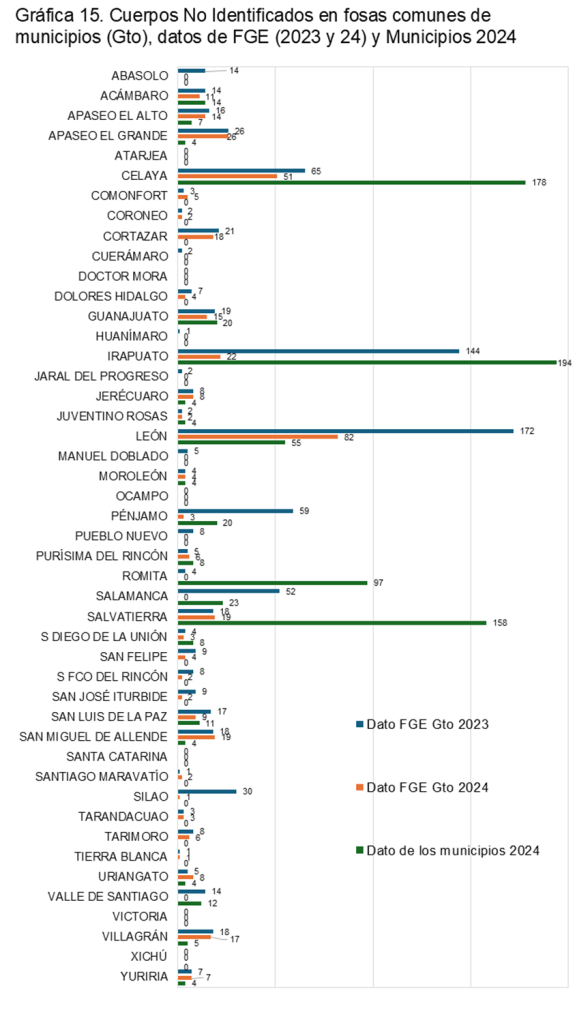 En la gráfica 15, que cierra esta sección, se representan los mismos datos sobre fosas comunes de los municipios con barras agrupadas para mayor claridad.