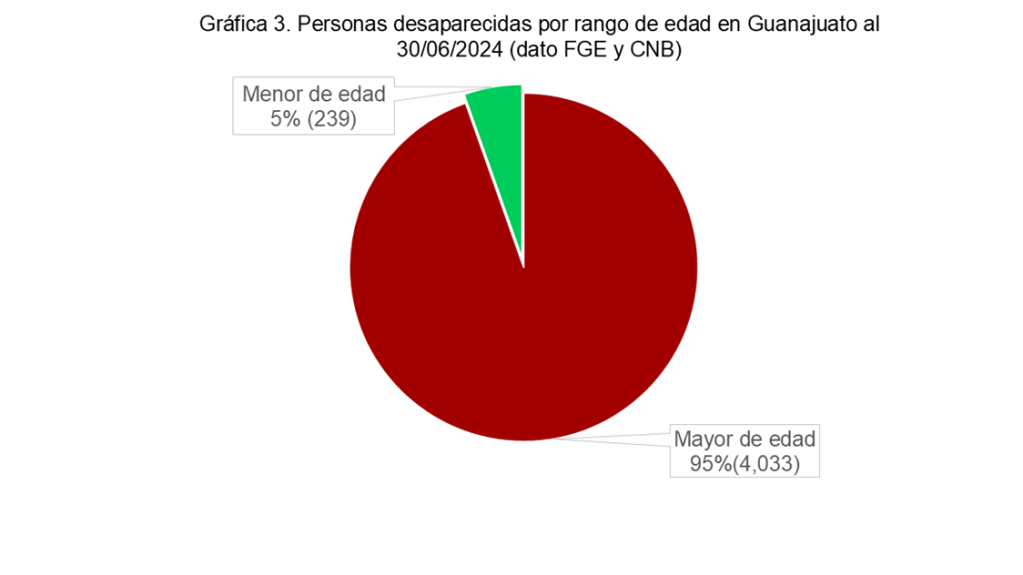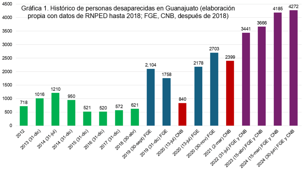Cabe destacar que las cifras obtenidas desde la fiscalía han estado más altas y se consideran más realistas y fehacientes respecto de las del registro nacional, pues éste, al 24 de agosto de 2024, señalaba tan solo 2,733 personas desaparecidas en Guanajuato, una cifra que, además, se ha mantenido bastante estable en el tiempo: esto puede deberse a que no hubo en los últimos meses o años cargas masivas de datos al registro por parte de la misma fiscalía o de la comisión estatal de búsqueda, o bien, a otros factores dependientes del RNPDNO, como los desfases en su actualización.