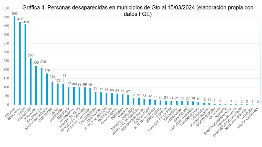 Los municipios con más personas desaparecidas son Celaya (505 personas), Irapuato (472), León (459), Villagrán (265) y Pénjamo (222).