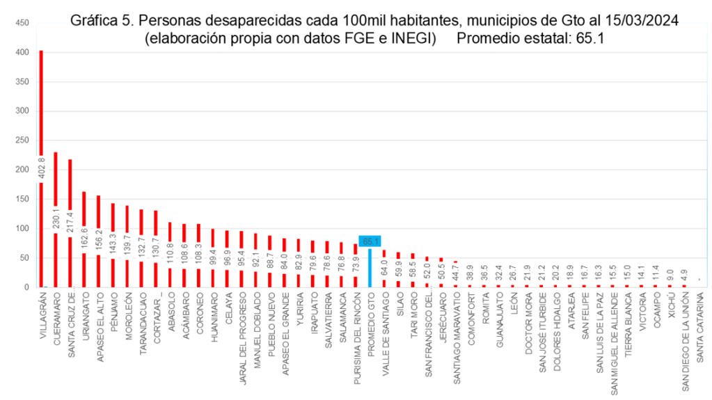 Villagrán, Cuerámaro, Juventino Rosas, Uriangato y Apaseo el Alto son los primeros cinco municipios por tasa de personas desaparecidas cada 100,000 habitantes, o sea, como proporción de su población.