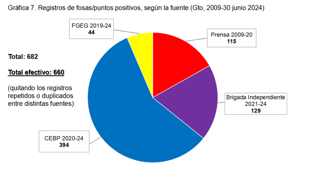 Finalmente, Prensa, CEBP, FGEG y la Brigada en estos años han entregado información acerca de 682 fosas clandestinas, pero, quitando las fosas presentes en sitios repetidos entre fuentes, el total final efectivo es de 660 fosas clandestinas en la entidad, muchas más que las que normalmente se dan a conocer oficialmente o en medios de comunicación.