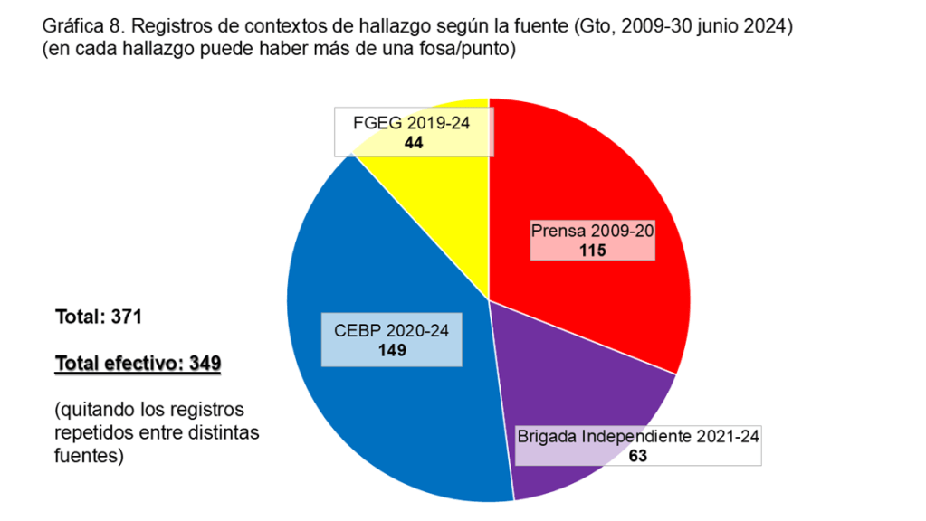 En Guanajuato los contextos efectivos de hallazgo entre 2009 y 2024 han sido 349. La cifra de 371 indica, en cambio, el número total de registros que las cuatro fuentes disponibles comunican, pero, como ya se mencionó, hay 22 contextos o sitios que se repiten entre ellas.