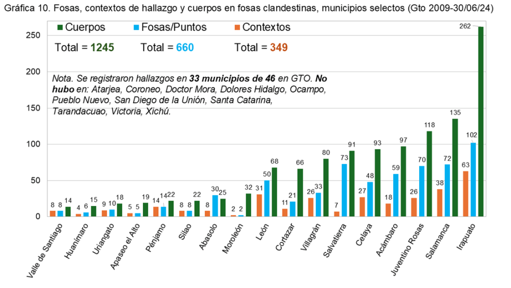 En 33 de 46 municipios de Guanajuato se han registrado fosas clandestinas con cuerpos o restos humanos entre 2009 y 2024. No hubo en Atarjea, Coroneo, Doctor Mora, Dolores Hidalgo, Ocampo, Pueblo Nuevo, San Diego de la Unión, Santa Catarina, Tarandacuao, Victoria y Xichú.